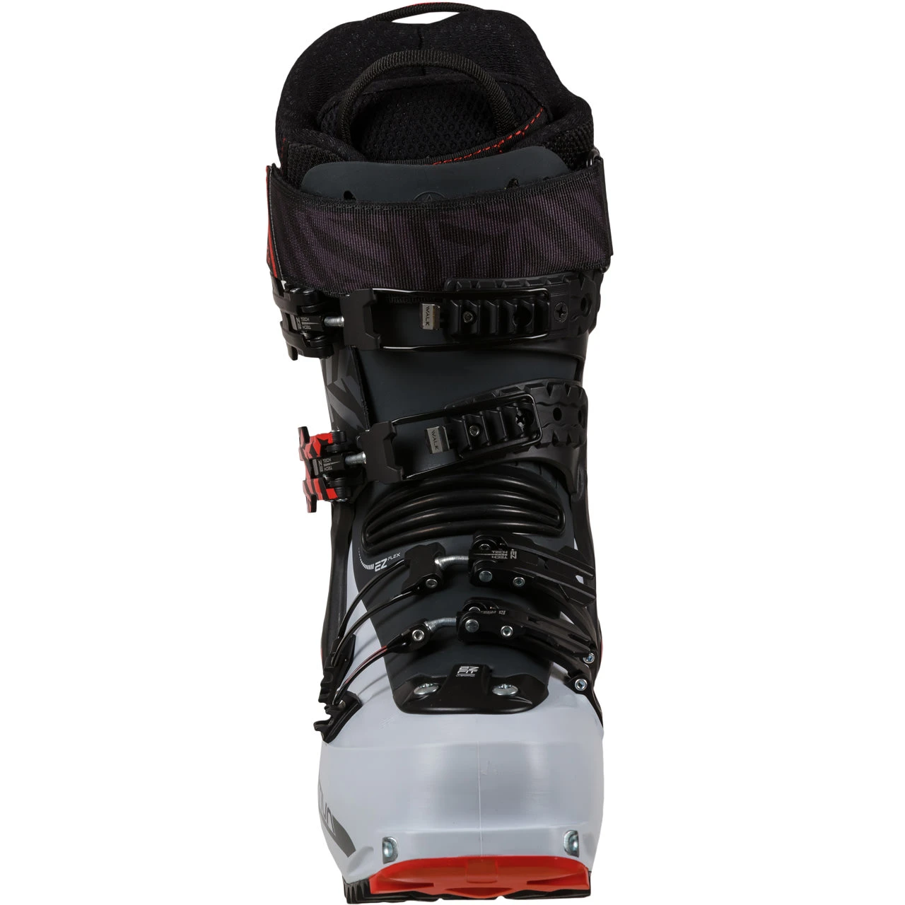 The mobility of the cuff, equal to 60° of the total excursion, combined with the accentuated rolling and the patented EZ Flex™ hinge system of the bootie, enhances the walkability of the product, which can also be used for technical passages on rocks and slippery ground thanks to the integral Vibram® sole dual-compound/double. The dual compatibility with both race TECH and AT bindings allows excellent versatility of use.