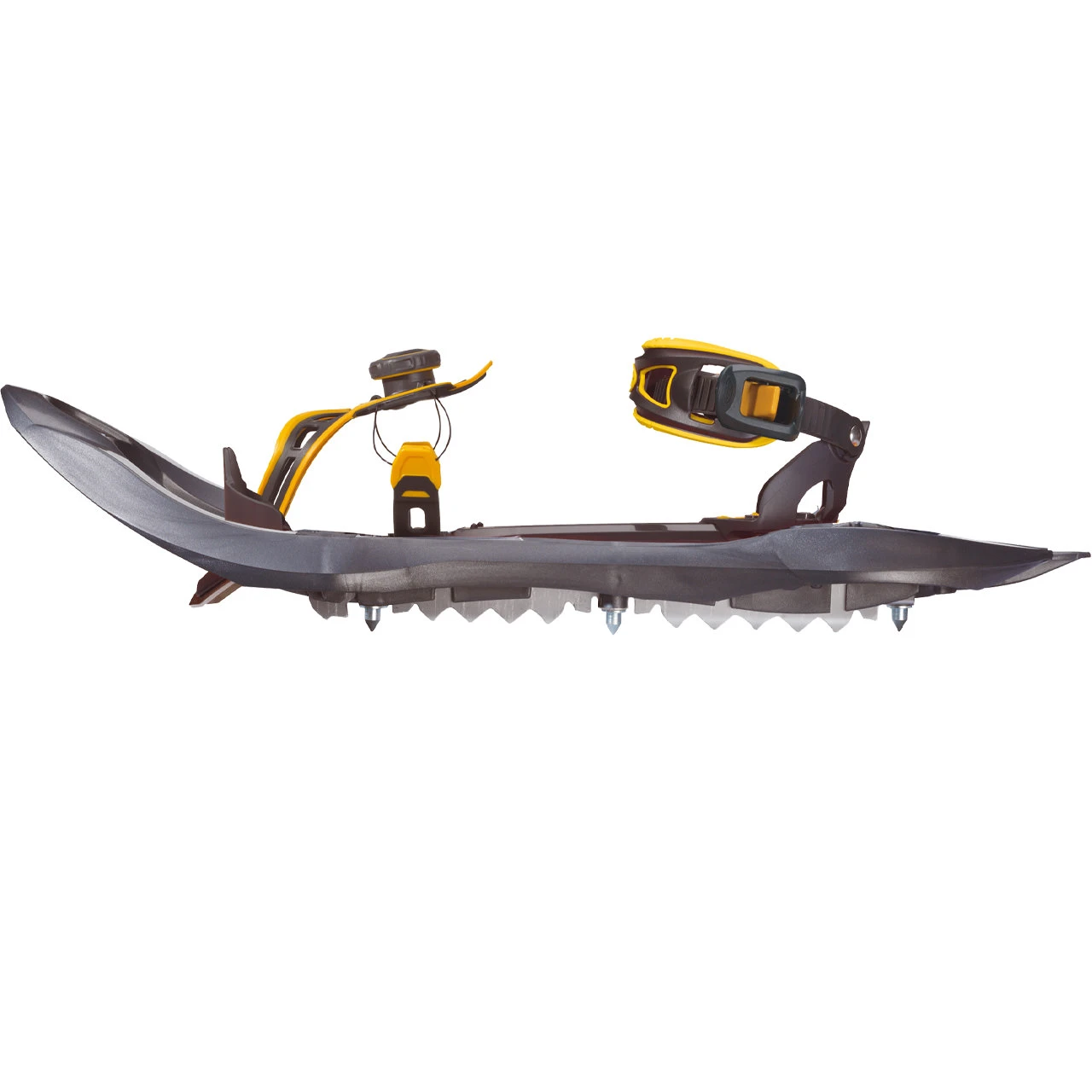 These models are fitted with an Up&Down lift (TSL patent) to reduce the effects of walking uphill and downhill (the back of the binding passes under the frame to keep the foot flat and prevent it from pressing against the toe of the shoe). The binding allows you to put the snowshoe on quickly, precisely and comfortably, and it memorizes the size of your shoe. Finally, the 8 crampons, the front teeth and the grips under each foot provide maximum traction